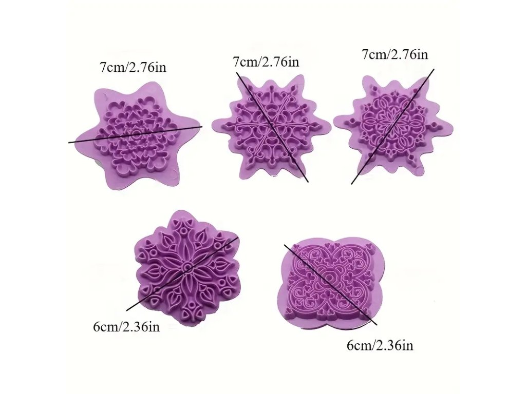 Sada obsahuje razítka s motivem mandaly a krajky, které jsou ideální pro výrobu náušnic, přívěsků z polymerové hlíny, texturování mýdla či dekorování keramiky. S jejich pomocí můžete snadno a kreativně vytvářet jedinečné vzory. Razítka jsou vyrobená z kvalitního plastu a jsou navržena tak, aby usnadňovala práci s různými modelovacími hmotami.