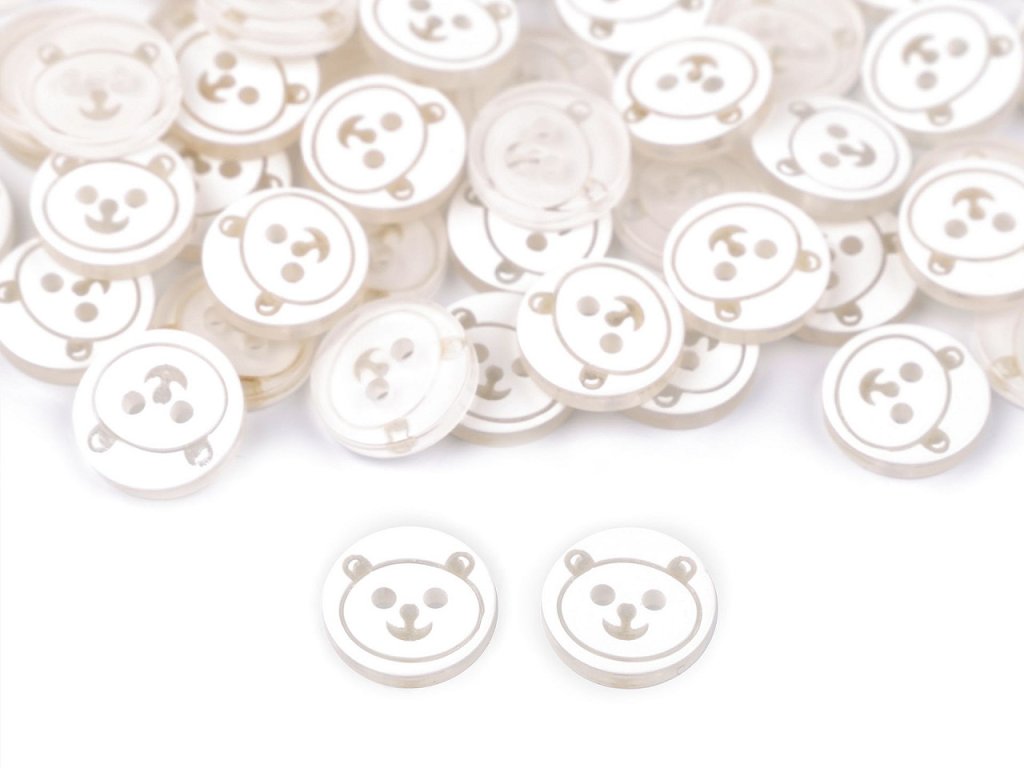 Dvoudírkové knoflíky zdobí motiv medvídka. Využijete je na dětské oděvy, ale také jimi můžete zkrášlit doplňky jako jsou tašky, čepice, rukavice apod.