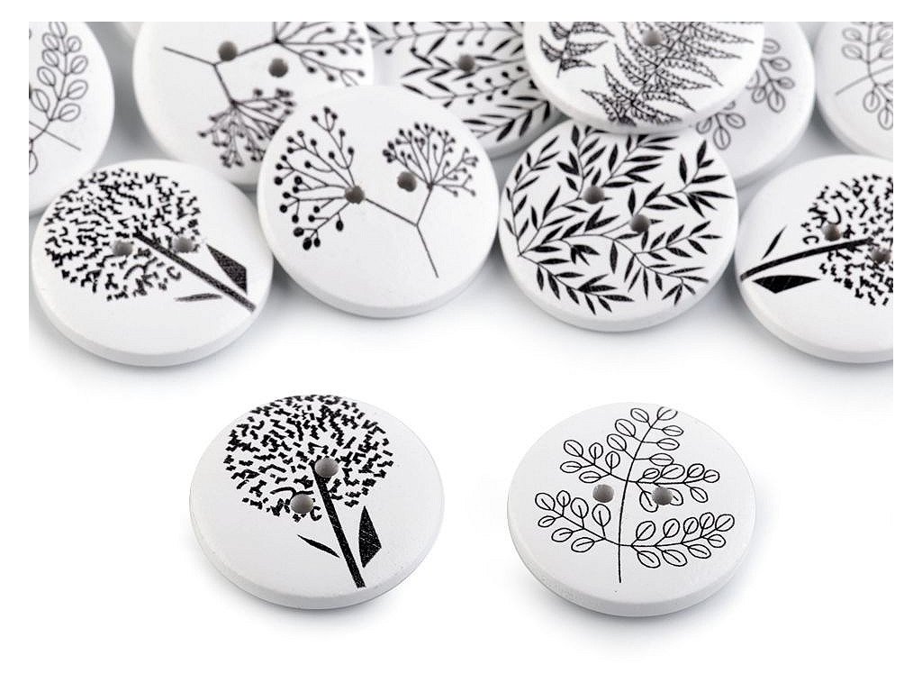 Dřevěné dekorační knoflíky s potiskem různých rostlin můžete použít ve scrapbookingu. Ozdobí vaše foto rámečky, přáníčka, jmenovky, pozvánky, deníky apod.