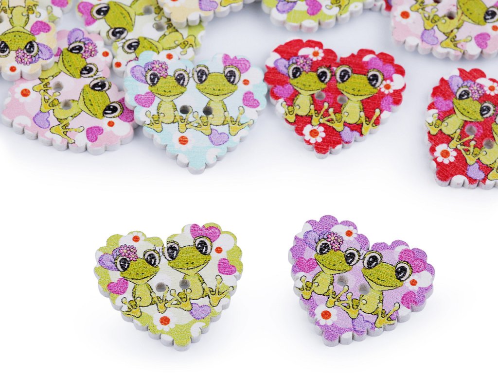 Dřevěné dekorační knoflíky s párem žabiček jsou vhodné ke zdobení alb, přáníček, krabiček, rámečků, květináčů, k balení dárků i k netradičnímu svatebnímu aranžování.