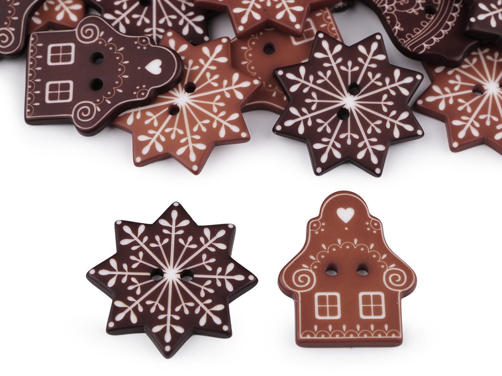 Dekorační knoflíky mají poutavé a precizní detaily, které jsou vyřezávané laserem. Věrohodně imitují perníčky. Vyniknou na vánočních dárcích, přáníčkách, věncích i v květinové vazbě.
