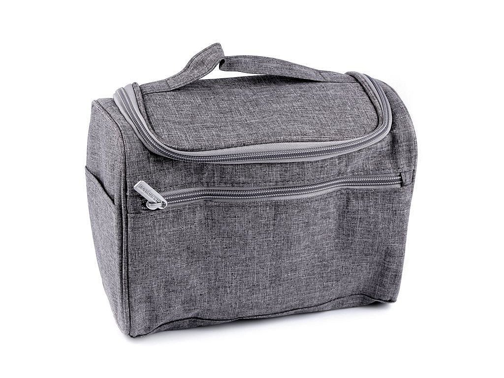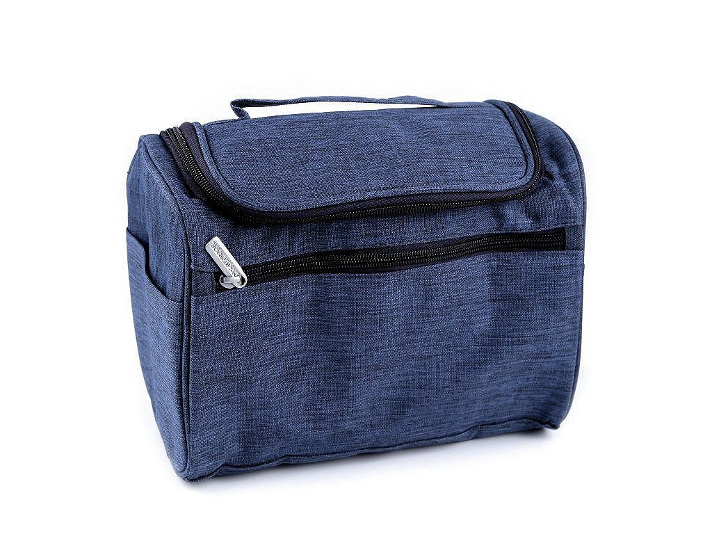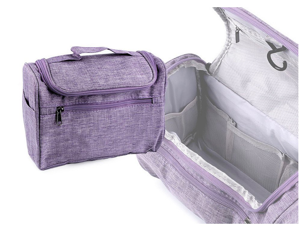 Má ramínko na pověšení, po jejím otevření na vás vykoukne perfektně zorganizovaný prostor. Uvnitř má po všech stranách malé síťované kapsičky, kam přehledně uložíte všechny drobnosti. Kapsiček je 7. Další kapsa se síťkou je ve víku tašky. Celá taška se zapíná na zip. Na přední straně má plochou kapsu na zip, další kapsy jsou i na bocích tašky. Uvnitř má podšívku, součástí tašky je praktické ucho na přenášení.