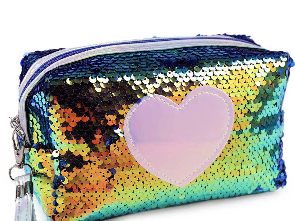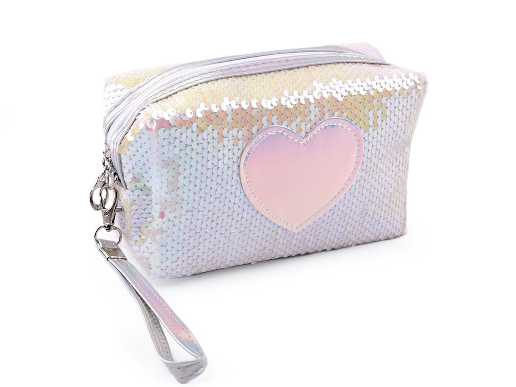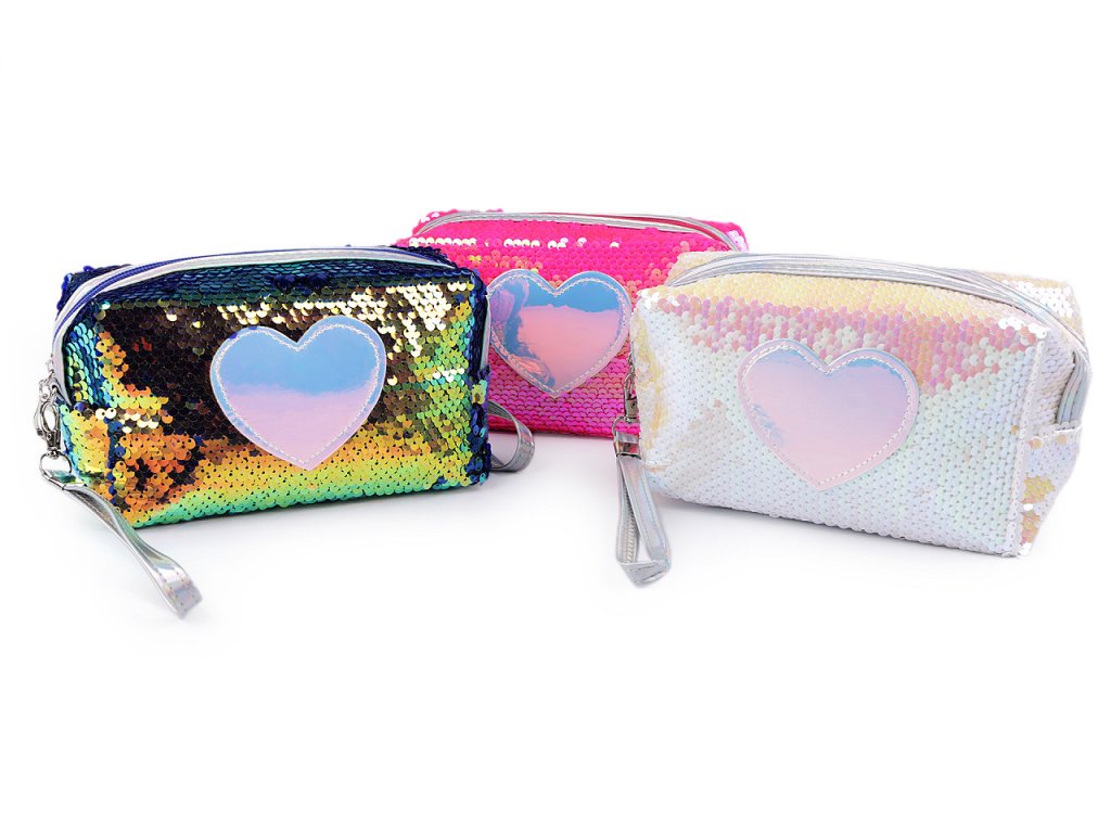 Kosmetická taška s oboustrannými flitry je velice atraktivní. Na přední straně je ozdobená velkým srdcem.
