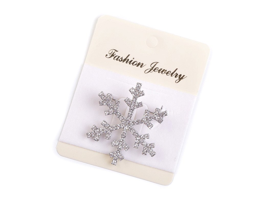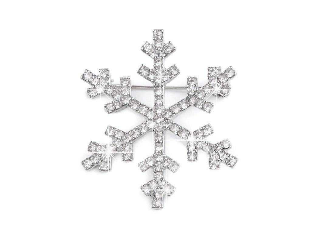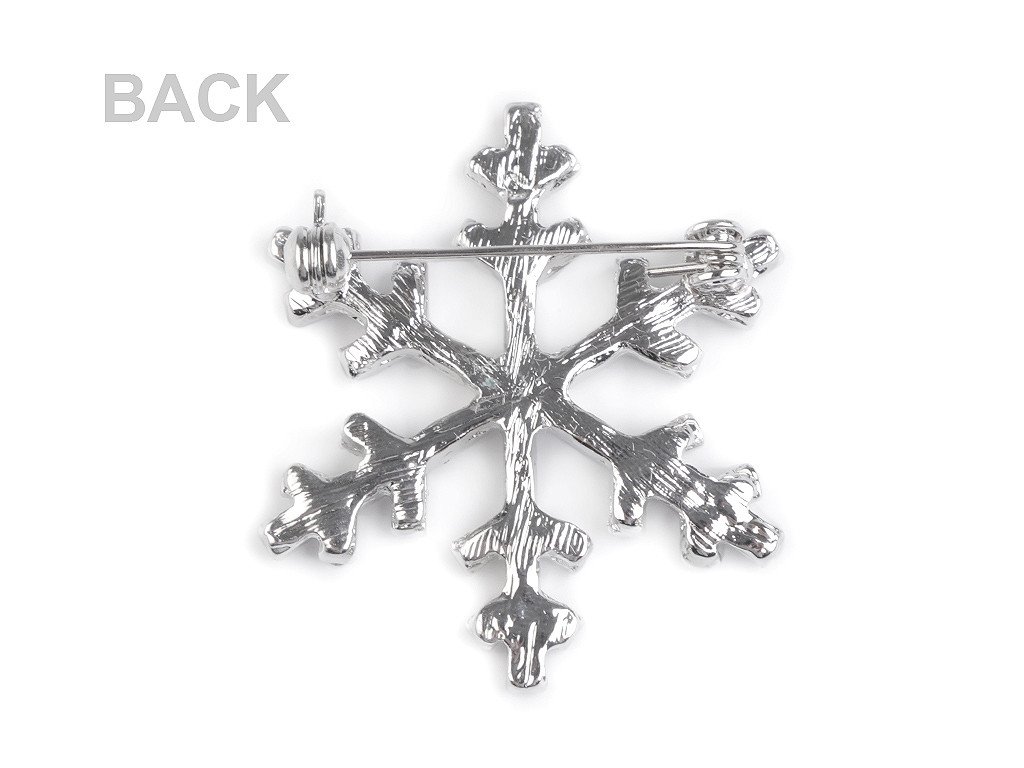 Třpytivá brož s vločkou je osázená broušenými kamínky. Na zadní straně má brožový špendlík, na kterém je pojistka proti nechtěnému otevření.