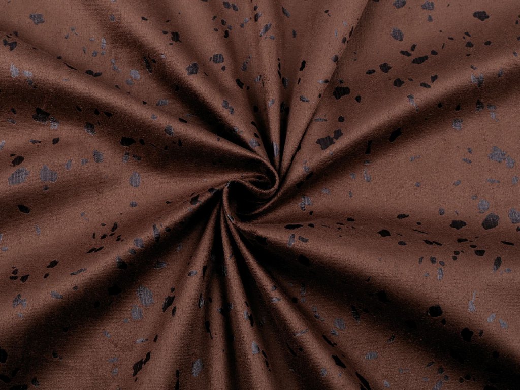 Imitace broušené kůže má jemný chloupek a potisk s efektem prskanců. Materiál je vhodný na šití oděvů, bytových doplňků jako jsou dekorační polštáře apod. Látka je jednostranná.