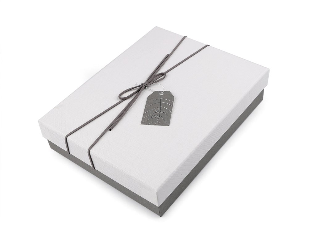 Luxusní papírová krabice je určená na středně velké dárky, např. na kosmetickou sadu, kožené rukavice, šátek, čepici apod. Je velice pevná, víko je ozdobené mašlí z eko kůže a elegantní visačkou se stříbrným potiskem For you. Zadní strana visačky je bílá, můžete na ní napsat jméno obdarovaného apod.