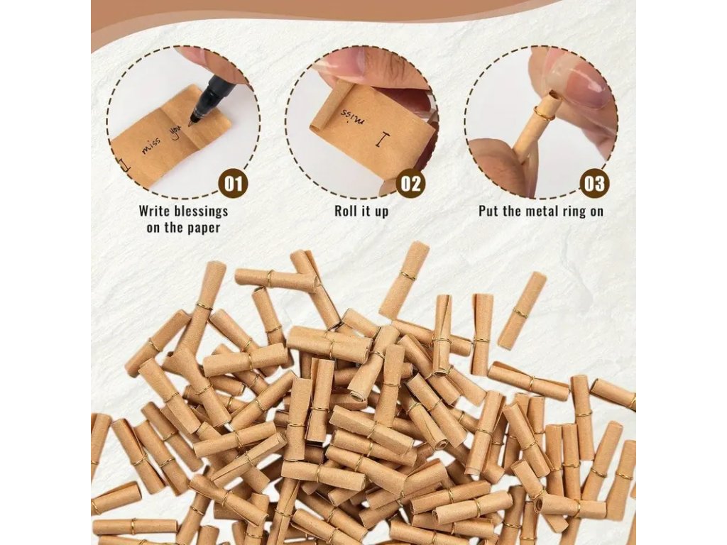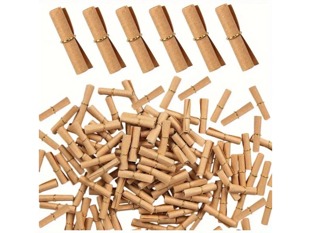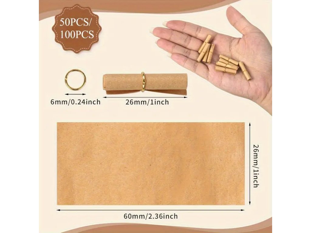 Sada obsahuje balení 50ks malých srolovaných svitků, které jsou uzavřené kovovým kroužkem. Každý svitek je prázdný a můžete do něj napsat vlastní vzkaz, přání nebo tajné poselství. Svitky jsou ideální jako originální dárek, dekorace, na svatby, oslavy nebo pro různé kreativní projekty.
