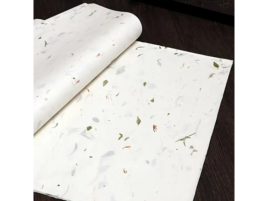 Ručně vyráběný rýžový papír s čajovými lístky/květy světlice barvířské je tradiční produkt, který se cení pro svou unikátní texturu a schopnost absorbovat barvu. Je ideální pro kaligrafii, balení dárků, umělecké projekty, řemesla a jako malířský papír.