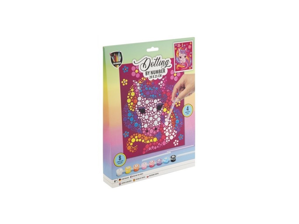 Sada obsahuje obrázek, který se vybarvuje pomocí teček dle předtištěných čísel, součástí je 8 ks barev a aplikátory.