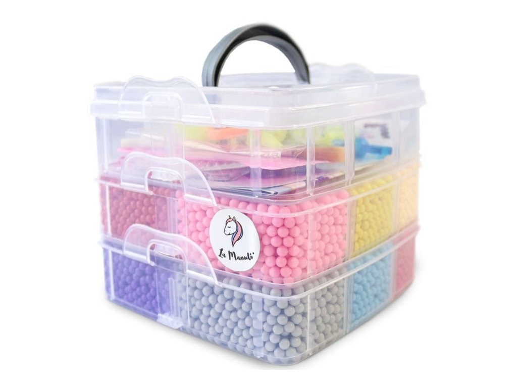 Vodní korálky jsou umístěny v přihrádkách umožňujících třídění barev v plastovém kufříku. Díky tomu budou korálky vždy na svém místě a dítě si s nimi může hrát v libovolném okamžiku.