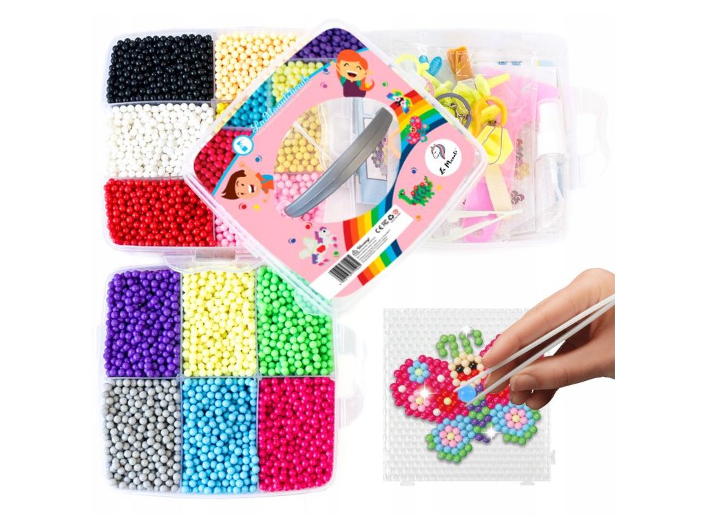 Nabízíme k prodeji hotovou sadu pro kreativní hraní v podobě přibližně 10 000 kusů vodních korálků různých barev spolu s šablonami, díky kterým bude dítě moci vytvářet pohádkově barevné vzory, obrázky, tvary, zvířata nebo postavy.