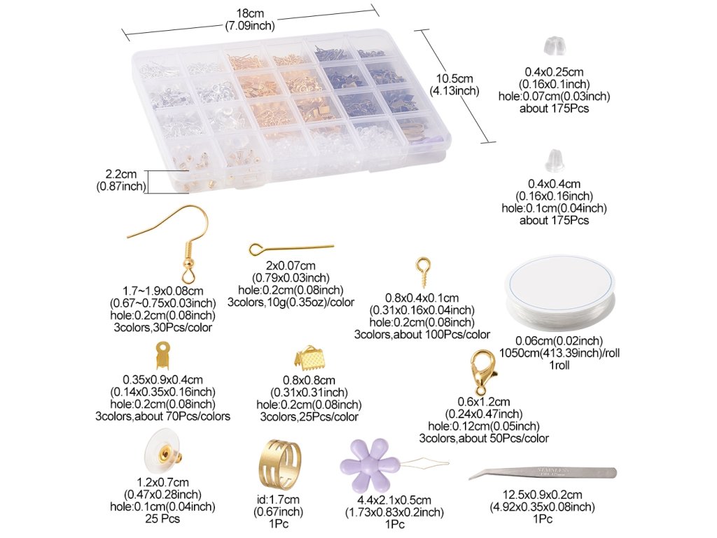 - Háčky na náušnice: 17–19 × 0,8 mm, otvor: 2 mm, tyč: 0,6 mm, 3 barvy, 30 ks/barva, celkem 90 ks