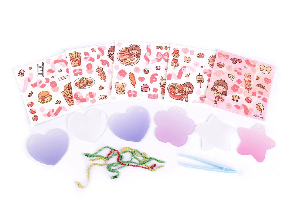 Kreativní sada se samolepkami na výrobu 6 přívěsků nadchne především děti. V transparentní krabičce najdou vše potřebné. Záleží jen na jejich fantazii, které samolepky si vyberou a nalepí na plastový základ přívěsku.
