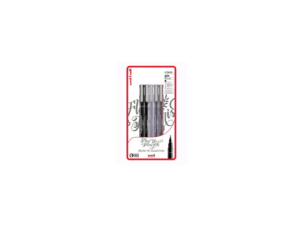 Balení pěti linerů obsahuje štětcový hrot v černé, sépiové, tmavě šedé a světle šedá barvě a jeden černý tenký hrot 0,1 mm. Skvěle se hodí k projektům s písmem a faux kaligrafií.