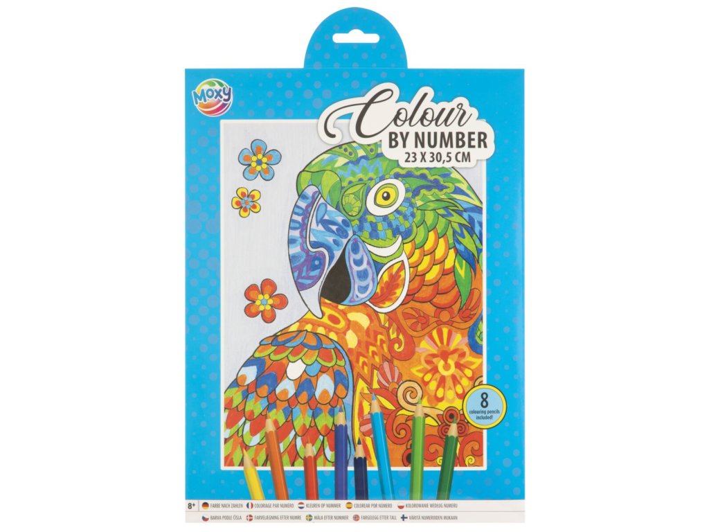 Obrázek je rozdělen na jednotlivá číselná políčka, pastelky mají také čísla a jen vybarvujete políčka podle čísel. Sada obsahuje 8 barevných pastelek, obrázek rozdělaný na dílky, předlohu a ořezávátko.