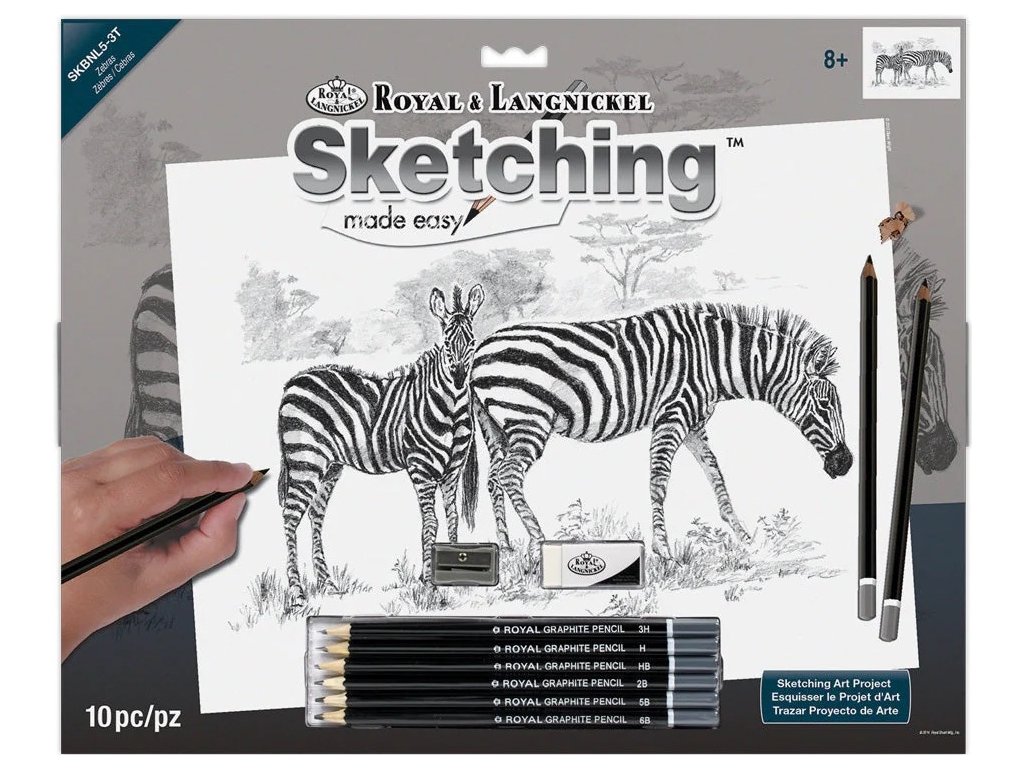Sada obsahuje 6 skicovacích tužek 3H,H,HB,2B,5B,6B, předkreslený obrázek, gumu a ořezávátko.