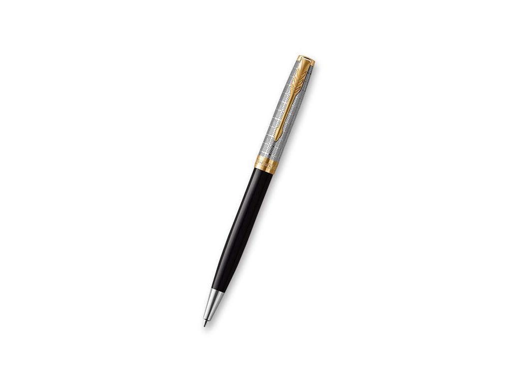 Kuličkové pero Parker Sonnet Premium Metal Black GT má černě lakované tělo a vrchní část z leštěné nerezové oceli se zdobným vzorem vytvořeným leptáním. V kombinaci s pozlacenými doplňky.
