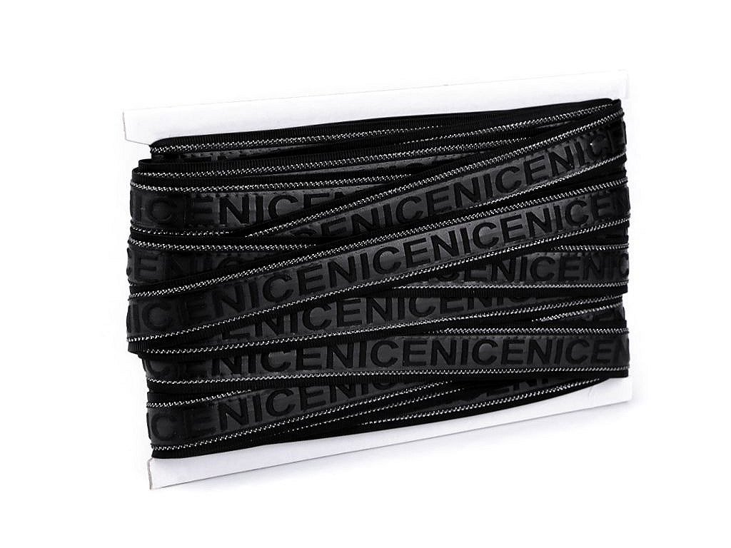 Kombinovaný lampas zdobí pololesklá našitá stuha s prošívaným nápisem Nice. Po stranách je navíc zvýrazněná třpytivým lurexem. Lampas je jednostranný, velice pevný, spodní část je z rypsové stuhy.