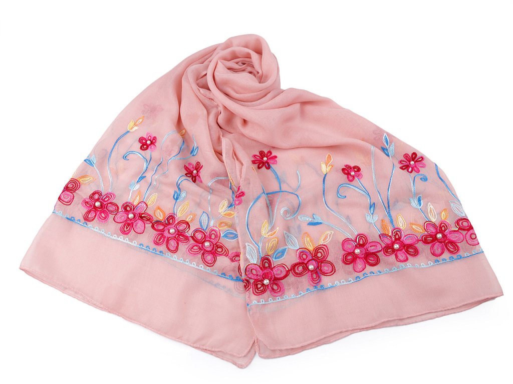 Lehkou vzdušnou šálu zdobí na obou koncích květinová výšivka. Šálu si můžete vzít jako doplněk ke kabátům, svetrům, tričkům i šatům.