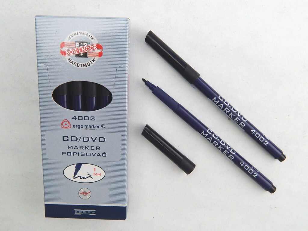 Popisovače plněné inkousty na alkoholové bázi, odstín červený,modrý,zelený,černý. Stopa písma je odolná otěru a působení vody.Jsou určeny k popisování CD,DVD a BD disků.V případě potřeby je možné popis odstranit lihem.Jsou osazeny kulatými hroty o průměru 2 mm a je možné psát šířkou stopy písma 1 - 2 mm, délka 600 m.Baleny jsou v papírových krabičkách po 12 ks v jednom odstínu,v soupravách po 4 ks v plastových krabičkách nebo v 1 ks PP sáčku. Vyrobeno v EU.