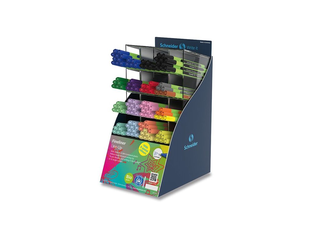 Stojánek 120 ks Lineru Schneider Line-up v mixu standartních a pastelových barev. Liner má vláknitý hrot zapuštěný v kovovém pouzdře. Je Pogumovaný a má trojúhelníkový tvar těla pro pohodlnější držení. Tělo je vyrobeno z 88 % plastu s BIO základem. Ideální pro kreslení i psaní. Víčko je v barvě náplně.