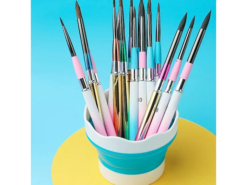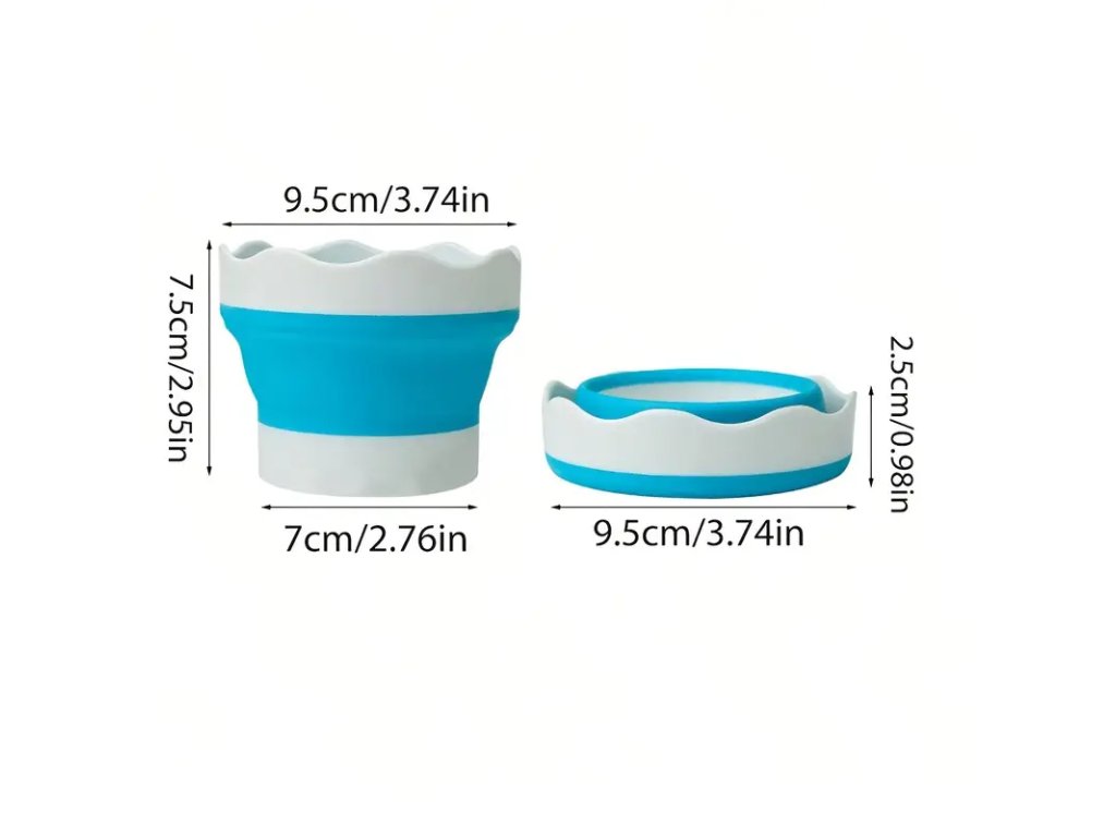 Kelímek na vodu v atraktivním designu s praktickým skládacím mechanismem. Nádobka má speciální okraj pro pohodlné odkládání stětce.