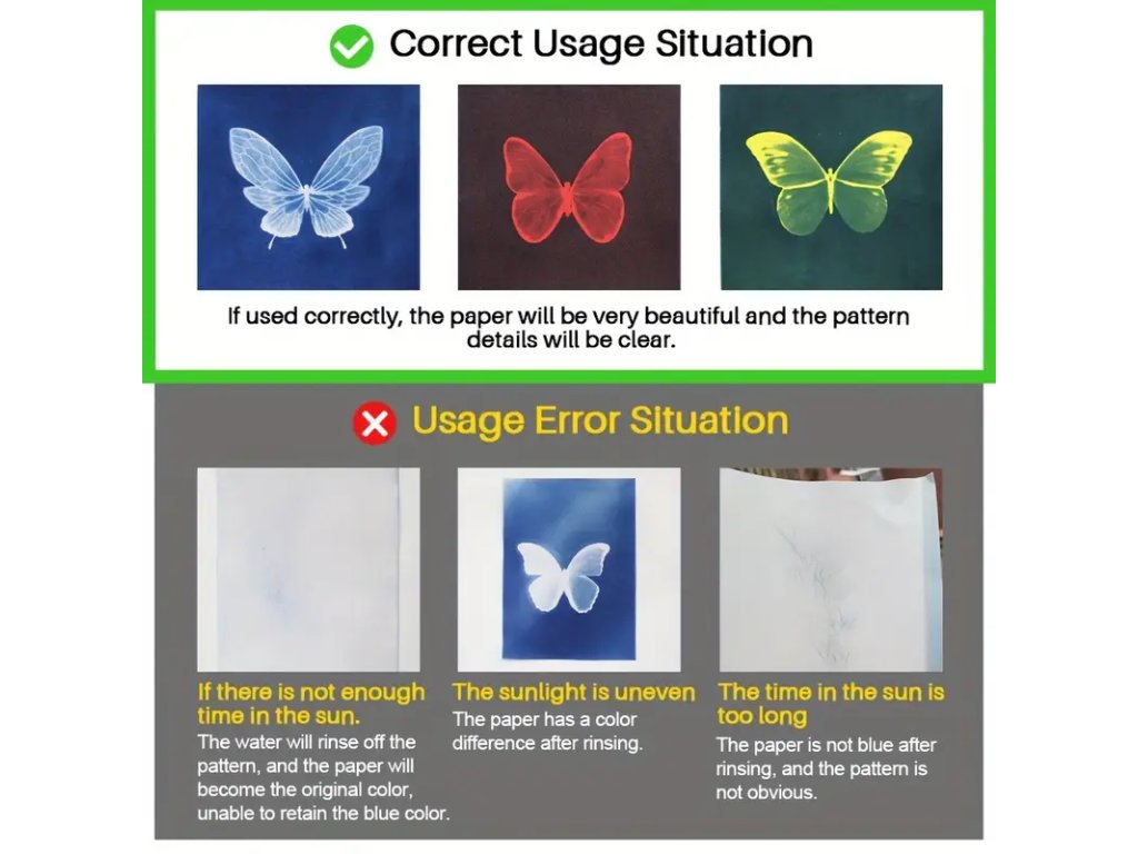 Pomocí slunečního světla a různých předmětů můžete vytvářet nádherné tmavě modré obrázky, které budou plné detailů a kreativních vzorů. Stačí na papír položit předmět, vystavit ho slunci a následně ponořit do vody, aby se objevily krásné siluety. Tento proces poskytuje jedinečný způsob, jak vytvářet originální díla.