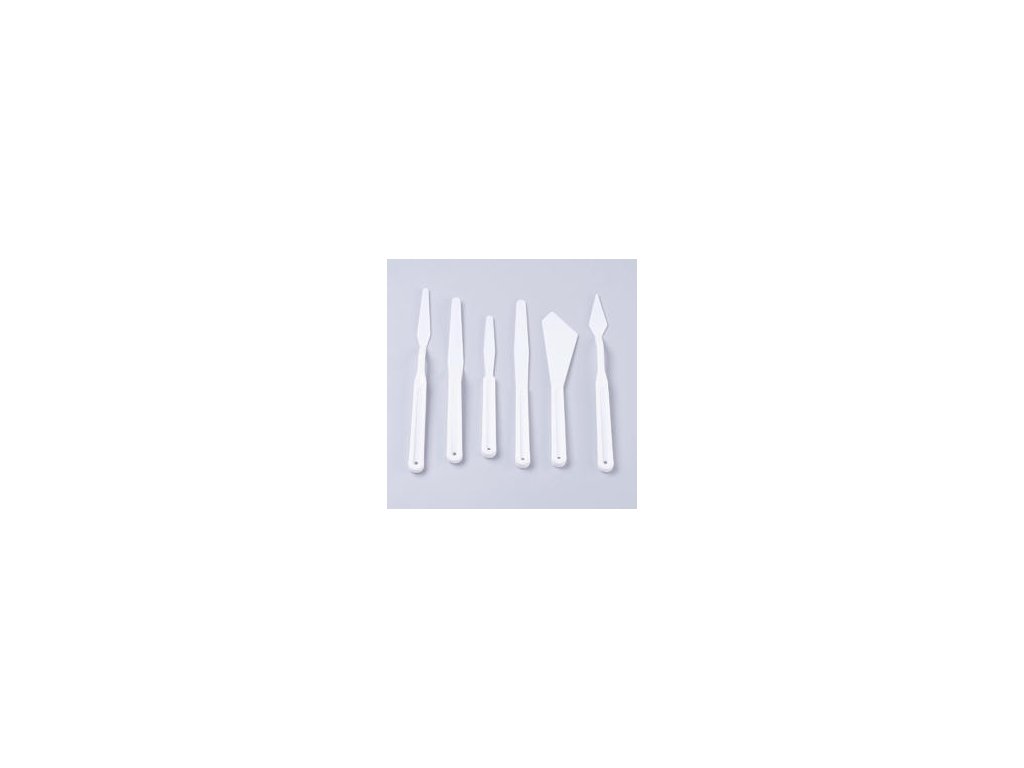 Šest různých druhy čepelí, vyrobeno z bílého plastu.