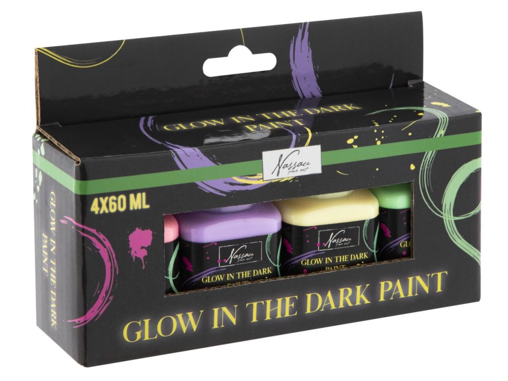 Obsahuje: Akrylové barvy 4 x 60 ml svítící ve tmě. Vhodné pro malování na papír, dřevo, sklo, keramiku, textil, kámen, modelovací hmotu, malířské plátno, malování na kameny apod. Pro získání více barevných odstínů můžete barvy vzájemně míchat. Dají se ředit vodou.