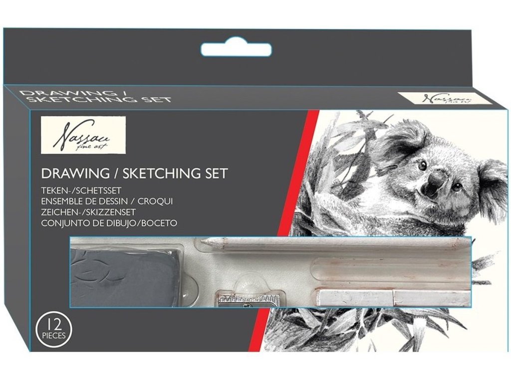 Sada obsahuje: 3x pastelové křídy( bílá, okrová, hnědá), 3x jemné pastelové tužky, 1x uhlová tužka bez dřeva,1x uhlová tužka( střední), 1x skicovací tužka (2B), 1x ořezávátko, 1x guma na hnětení, 1x papírový pahýl.