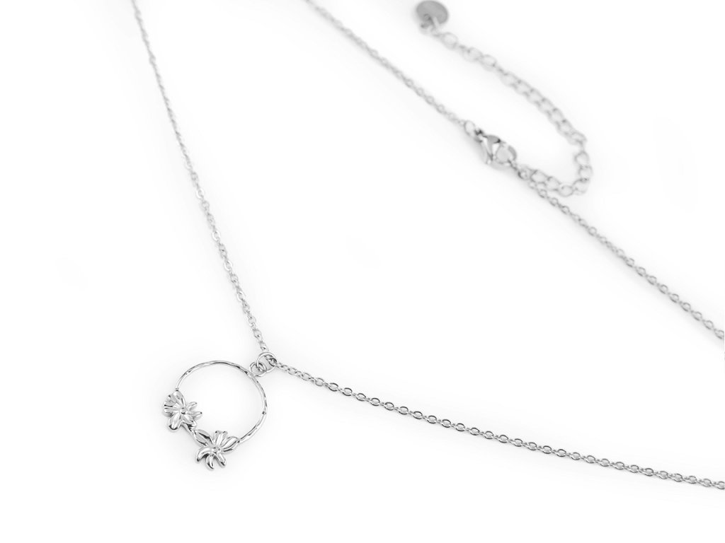Řetízkový náhrdelník s romantickým přívěskem kroužku s květy je vyrobený z kvalitní nerezové oceli. Přívěsek je zavěšený na kroužku, volně se na řetízku pohybuje. Náhrdelník decentně dozdobí většinu outfitů.