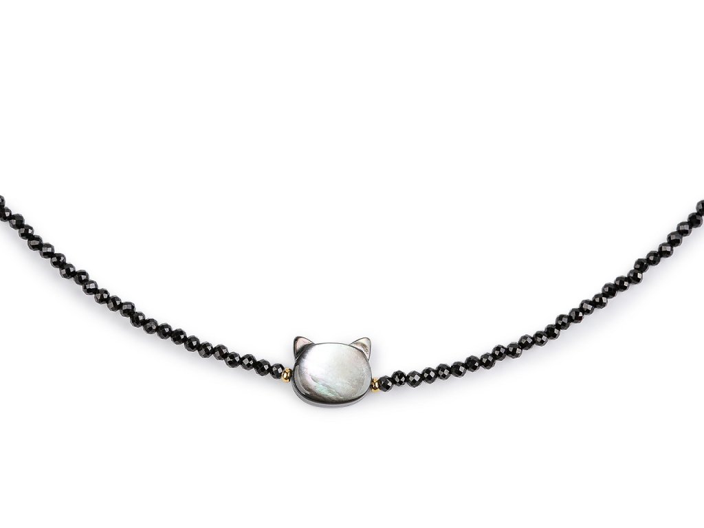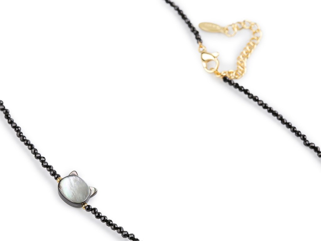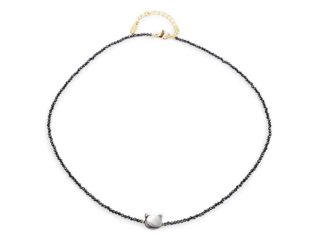 Náhrdelník z broušených korálků je ve svém středu ozdobený perleťovým korálkem kočky. Je elegantním doplňkem, který zaujme svým precizním zpracováním a jedinečným designem, decentně dozdobí váš dekolt. Je ideálním dárkem pro milovníky zvířat a všechny, kteří hledají něco originálního pro své každodenní outfity.