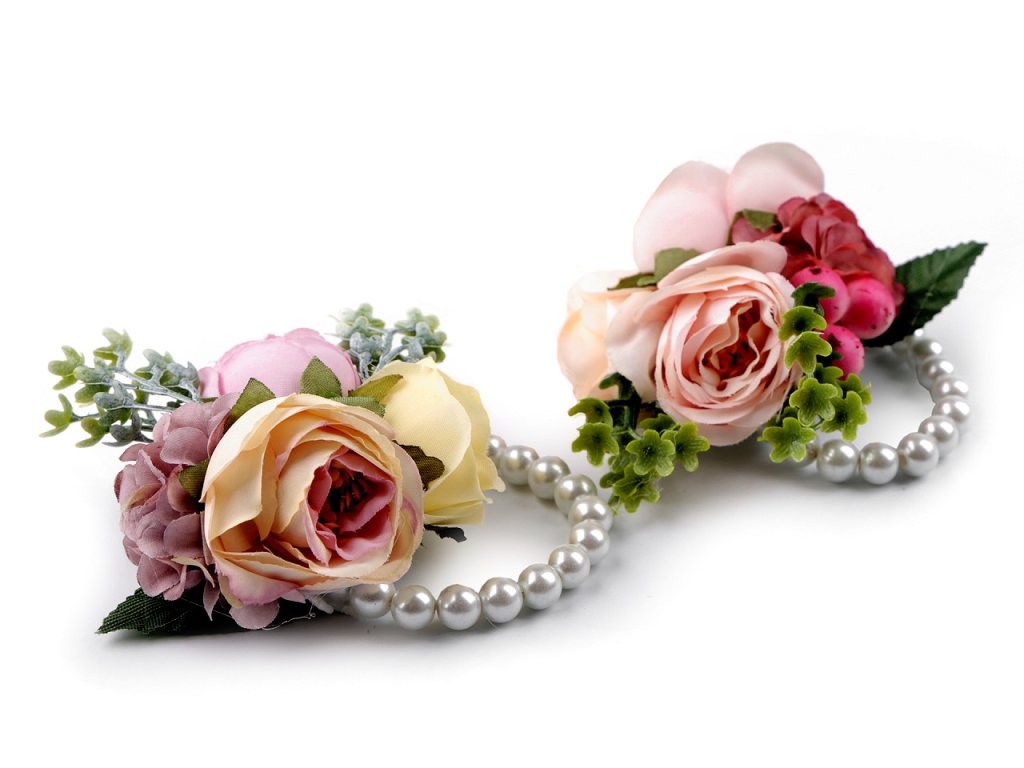 Perlový náramek s růžičkami je určený především pro svědkyni, družičky, maminku nebo jen tak. Potěší všechny ženy, které se rády zdobí romantickými doplňky. Je pružný, má univerzální velikost. Ve středu jsou 3 růžičky doplněné malou hortenzií, bobulemi, větvičkami a listem.