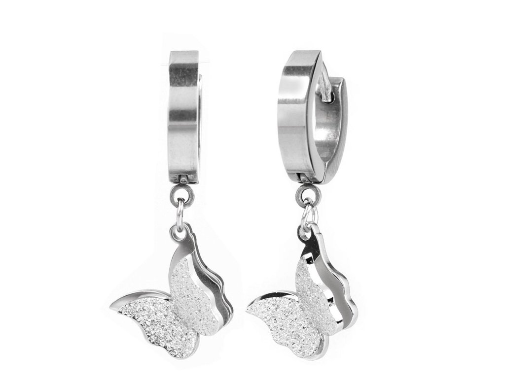 Náušnice z kvalitní nerezové oceli jsou zajímavé svým designem, působí elegantním dojmem. Mají přívěsky motýlů zavěšené na kroužku. Díky pískování na křídlech se motýli efektně třpytí. Kroužky se dají rozevřít, zapínají se zacvaknutím.