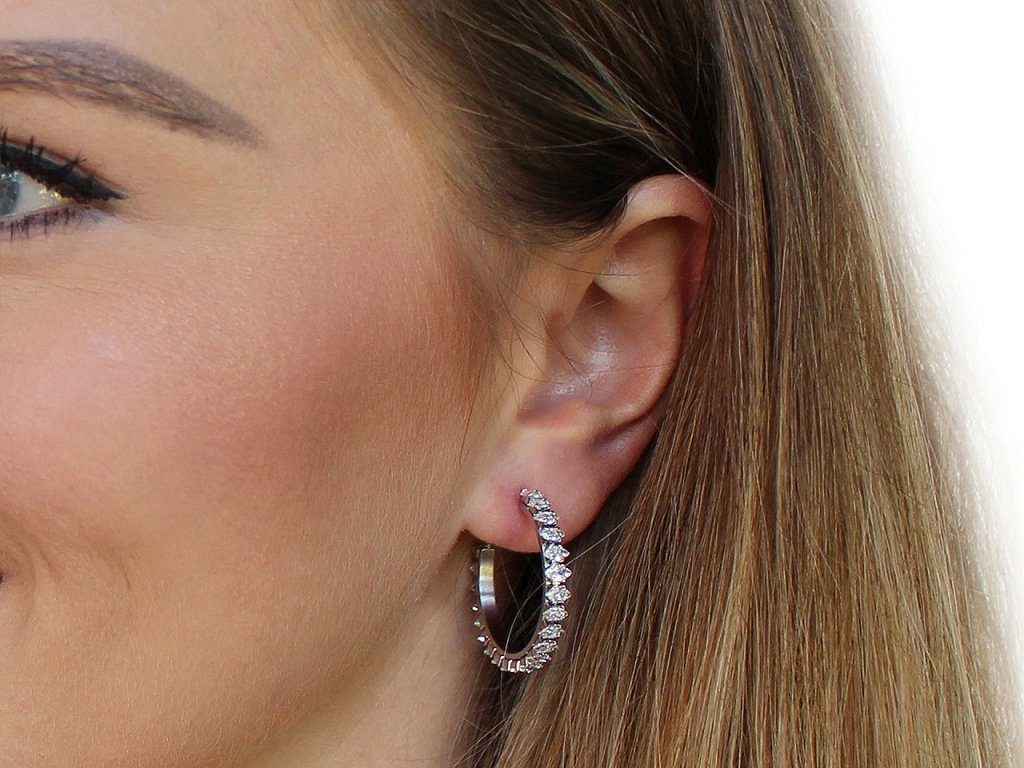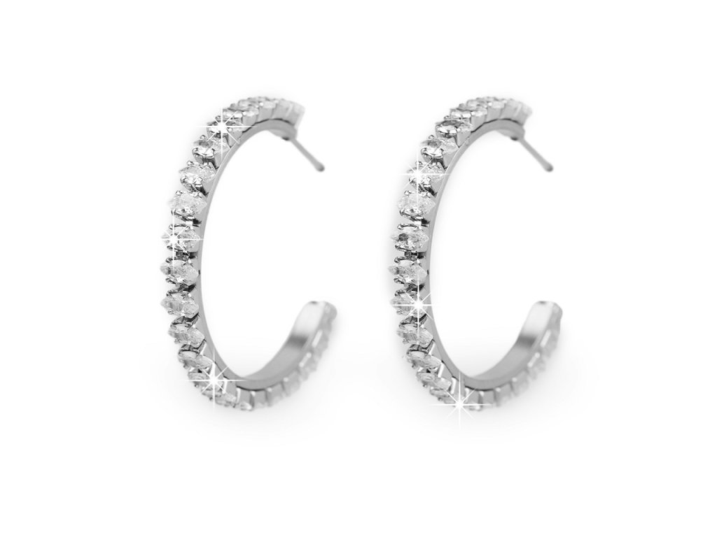 Náušnice z kvalitní nerezové oceli jsou osázené broušenými kamínky s oslnivým třpytem. Jsou nepřehlédnutelné, hodí se ke slavnostním šatům, ale využijete je i na běžné nošení. Mají tvar neuzavřeného kruhu.