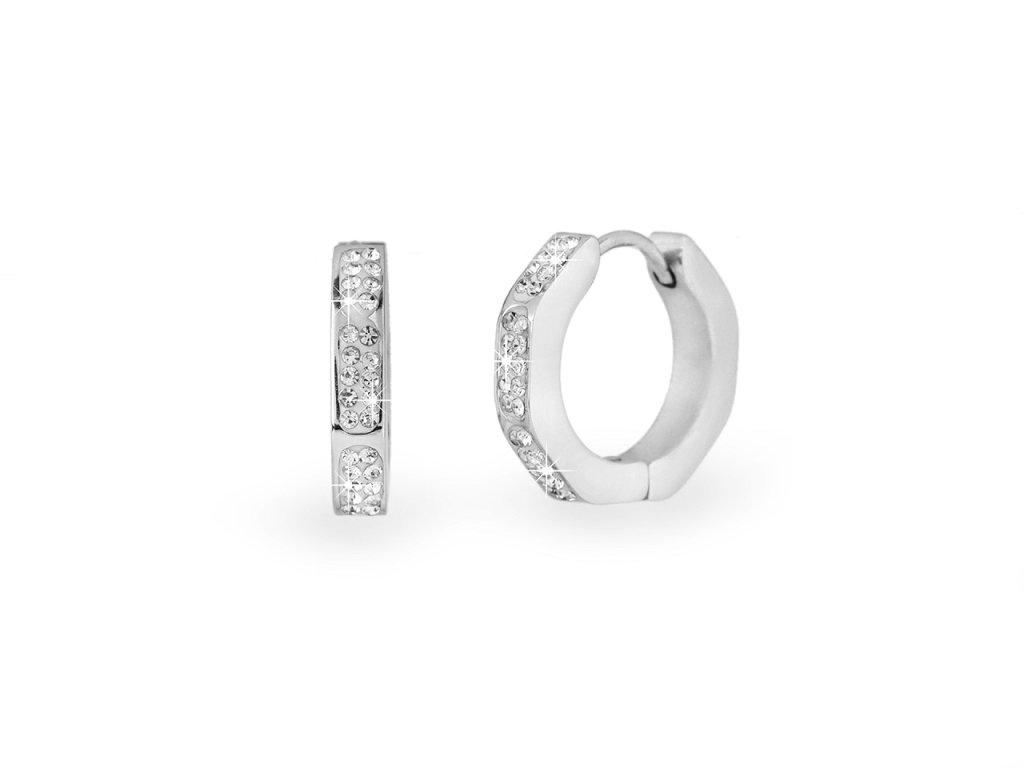 Kruhové náušnice z kvalitní nerezové oceli jsou velice elegantní. Z čelní, pohledové strany jsou ozdobené broušenými kamínky, které se jemně třpytí. Jejich tvar není pravidelný kruh, mají nepatrně zkosené hrany do osmiúhelníku. Oceníte je ke každodennímu nošení, ale hodí se i ke slavnostním příležitostem. Skvěle doplní byznys styl oblékání, jeansovou módu, ležérní outfity, ale i plesové šaty.