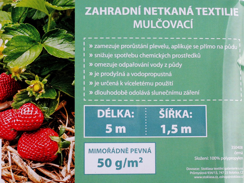 Mulčovací zahradní netkaná textilie je mimořádně pevná a určená k víceletému použití. Zamezuje prorůstání plevelu, aplikuje se přímo na půdu. Snižuje spotřebu chemických prostředků. Omezuje odpařování vody z půdy. Dlouhodobě odolává slunečnímu záření. Je prodyšná a vodopropustná.