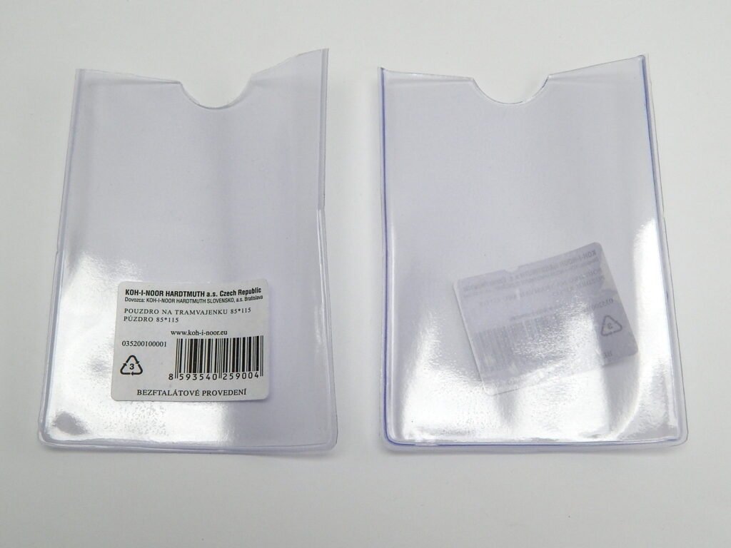Transparentní pouzdro z BEZFTALÁTOVÉHO materiálu otevřené v horní části s palcovým výsekem je určeno k úschově dokladů, průkazů, průkazek MHD apod. , k jejich ochraně proti poškození. Vyznačuje se vysokou pevností svárů a jejich odolností proti roztržení. Pouzdro je jednotlivě značeno etiketou s EAN kódem.
