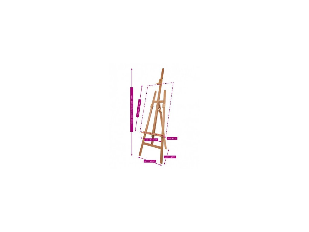 Malířský stojan A buk Mabef - M/13 je typický malířský stojan typu A oblíbený pro své univerzální použití. Centrální část je možné jednoduše zvedat/snižovat zepředu stojanu pomocí kovového posuvníku. Horní úchyt je plně posuvný pomocí šroubu. Náklon je nastavitelný dle potřeby zadní nohou. Dodatečnou stabilitu plátna zajišťují posuvníky na 2 postraních částech stojanu.
