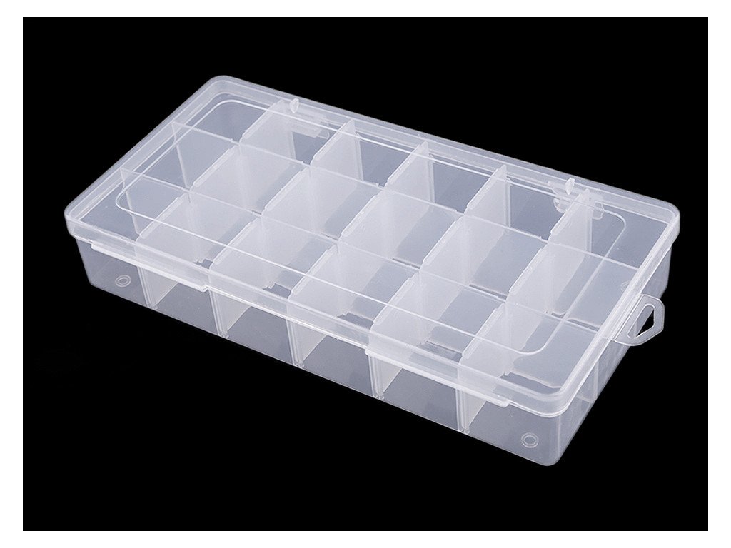 Má 18 přihrádek o velikosti 3,5 x 3,5 x 3,5 cm. Přihrádky si můžete regulovat pomocí odstranitelných přepážek (3x dlouhé vcelku - odstranit nejdou, 15 x krátké jednotlivé - lze odstranit). Pokud odstraníte všechny malé přepážky, budete mít 3 přihrádky o velikosti 3,5 x 22,5 cm. Krabička je uzavíratelná.