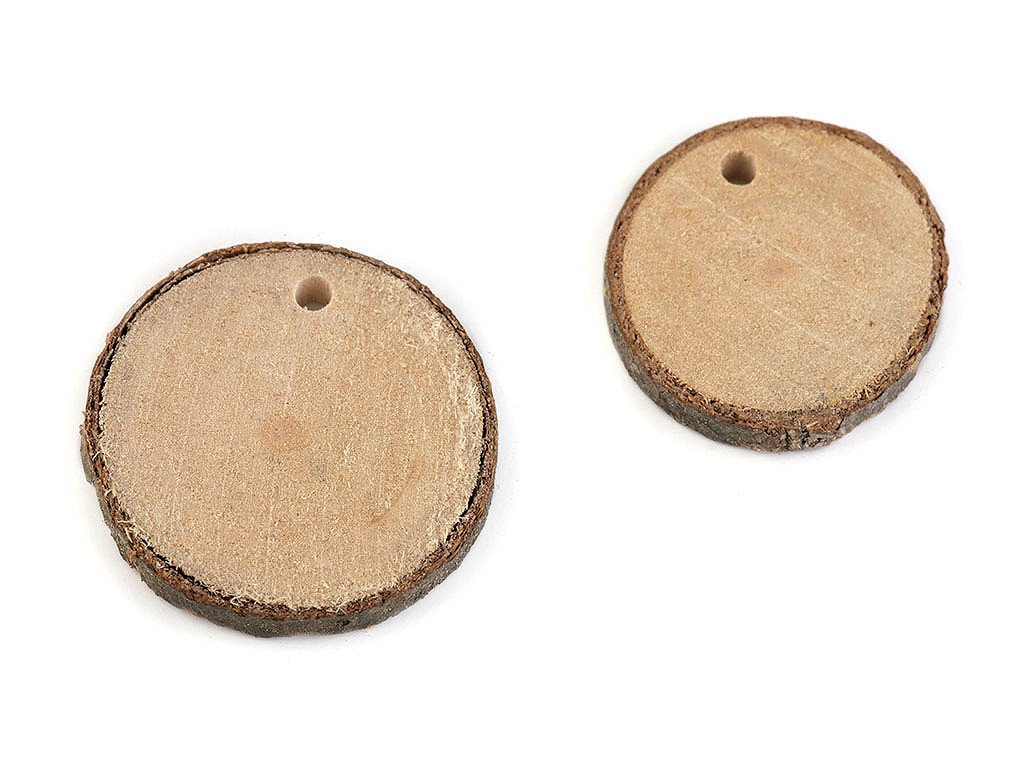 Přírodní dřevěný přívěsek se hodí k dalšímu dotvoření. Je rovný, nahoře má otvor k zavěšení. Není barvený ani lakovaný, každý kus se může lišit jak barvou, tak kresbou dřeva. V balení mohou být přívěsky s kůrou i bez kůry.