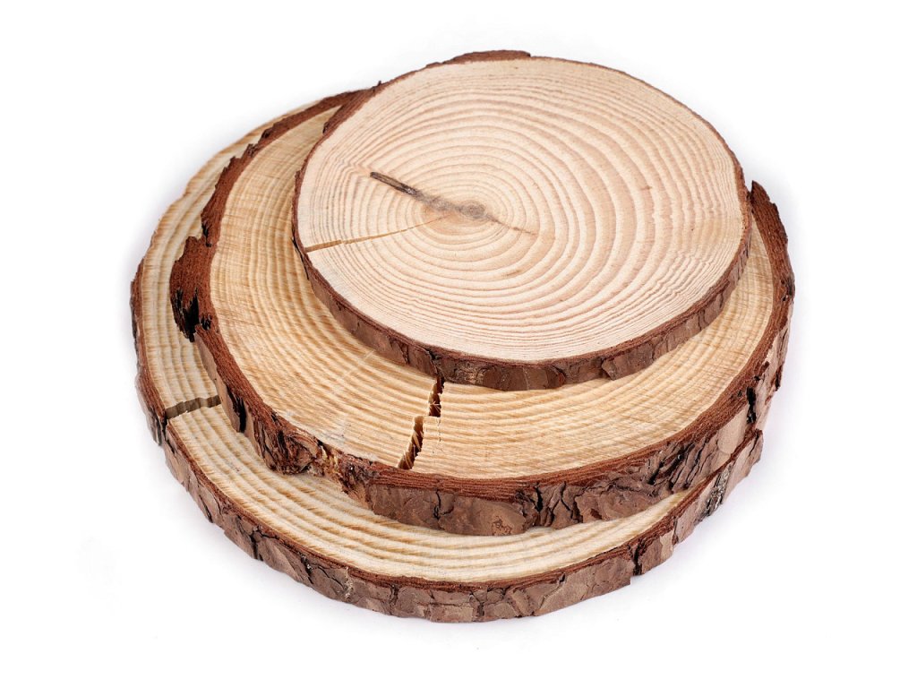 Kolečko z přírodního dřeva se hodí k dalšímu dotvoření. Je rovné, po obvodu má kůru. Není barvené ani lakované, každý kus se může lišit jak barvou, tak kresbou dřeva, velikostí i tloušťkou.
