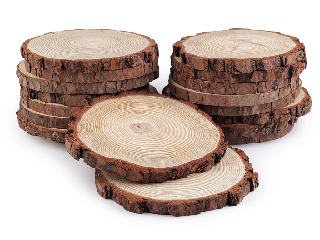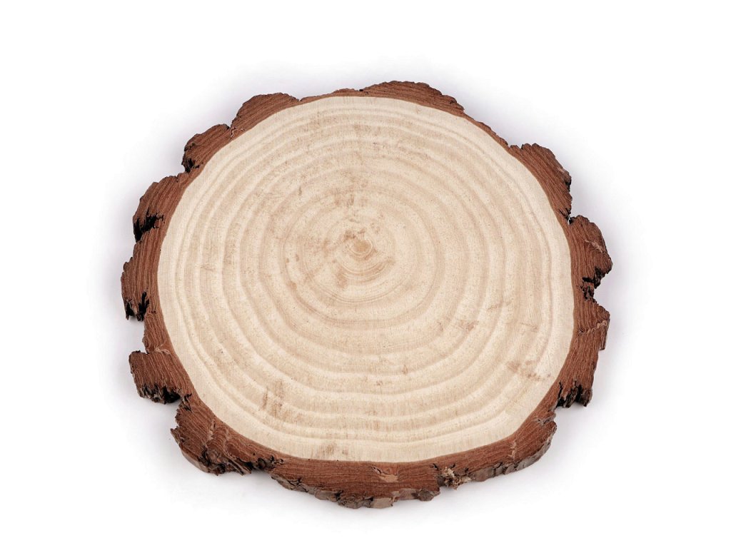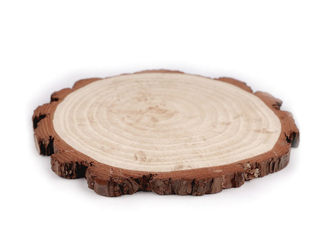 Velké přírodní dřevěné kolečko se hodí k dalšímu dotvoření. Je rovné, po obvodu má kůru. Není barvené ani lakované, každý kus se může lišit jak barvou, tak kresbou dřeva, velikostí i tloušťkou.
