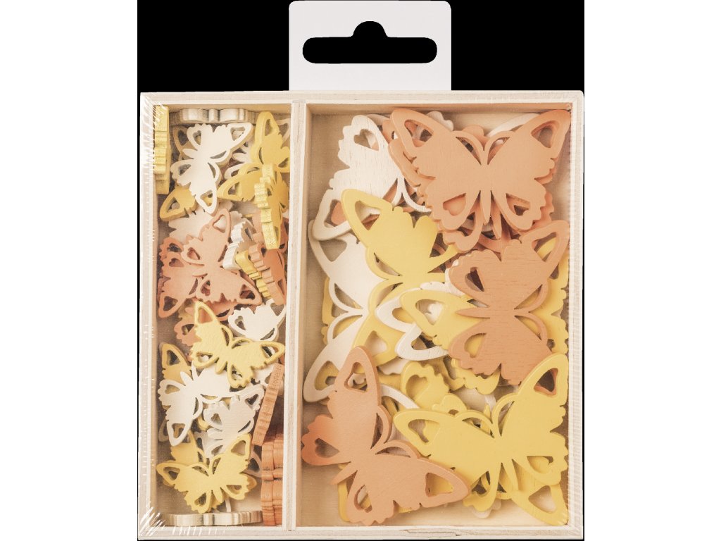 Dřevěné ozdoby v boxu, 54 ks - motýlci