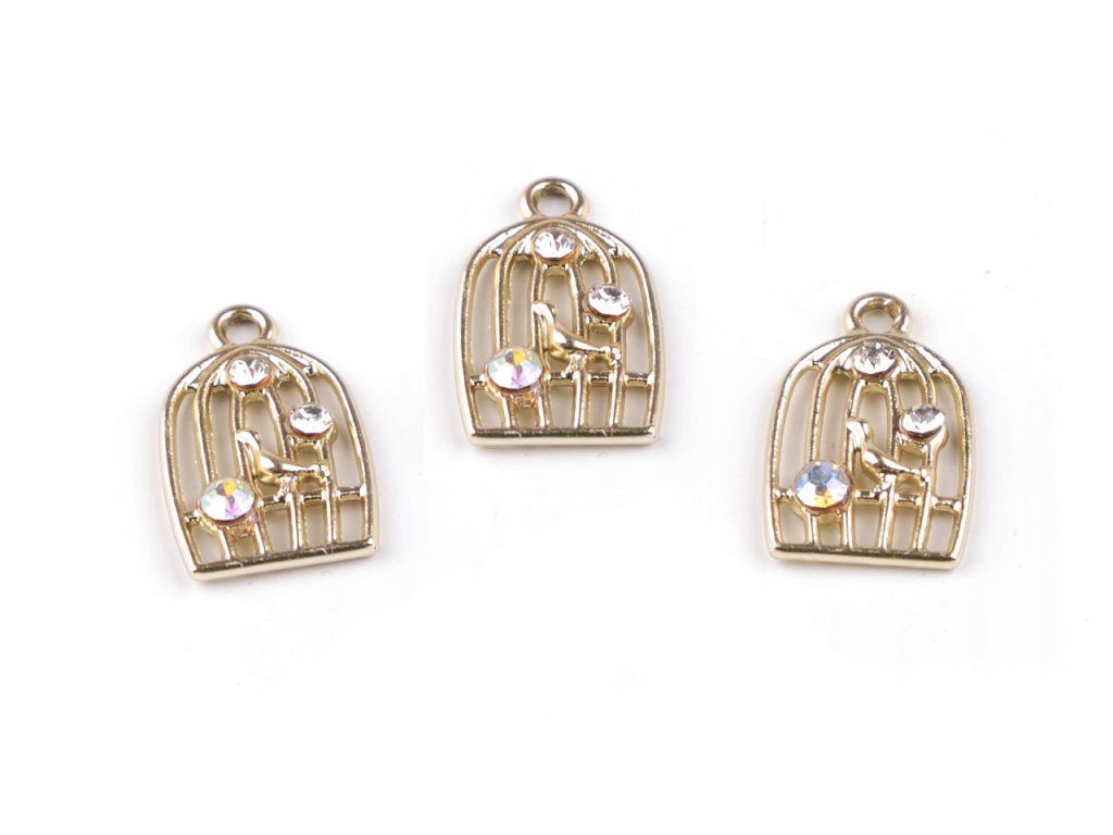 Kovový přívěsek klece je ozdobený broušenými kamínky. Je jednostranný, zadní stranu má plochou.