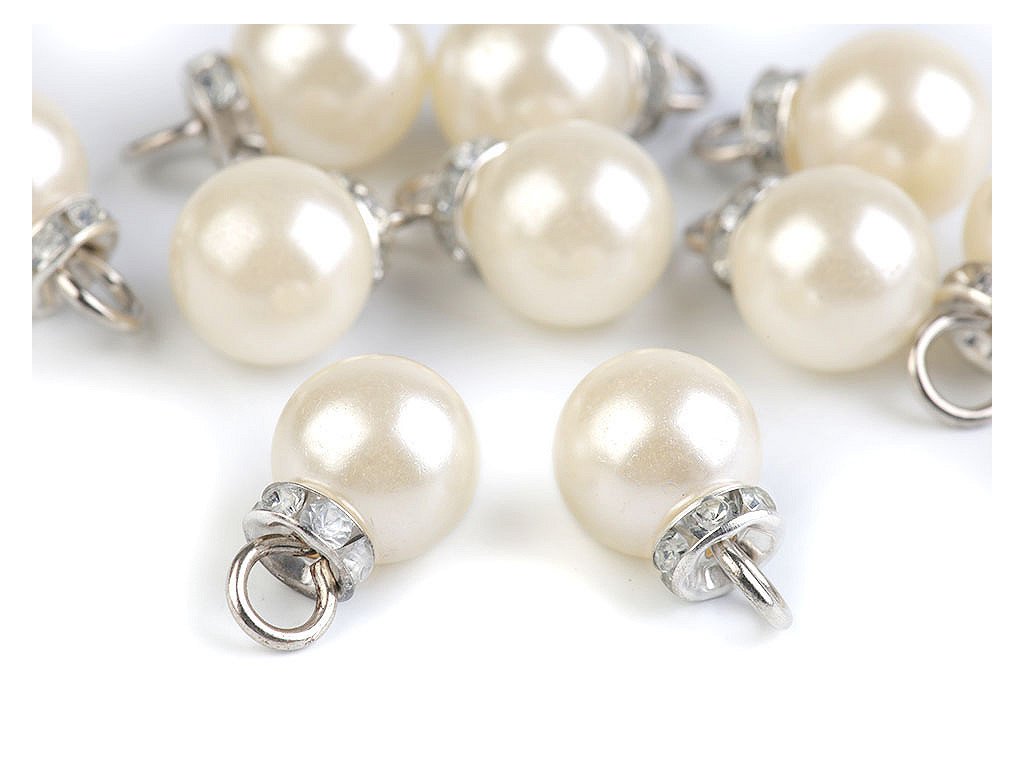 Perla je z plastového korálku s perlovým leskem, rondelka je dokola ozdobená drobnými třpytivými kamínky. Barva kovu je zlatá.