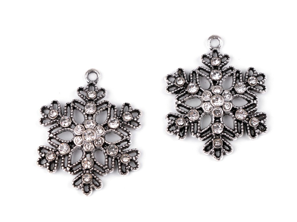 Kovový přívěsek ve tvaru sněhové vločky je osázený broušenými kamínky. Poutavě se třpytí, působí vintage vzhledem. Je mírně vypouklý, jednostranný.