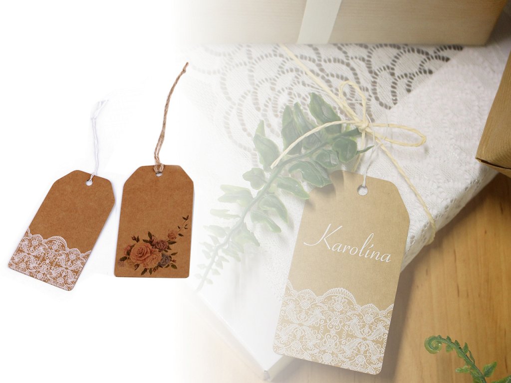 Visačka č.2 - s potiskem růží, má šňůrku z přírodní juty.