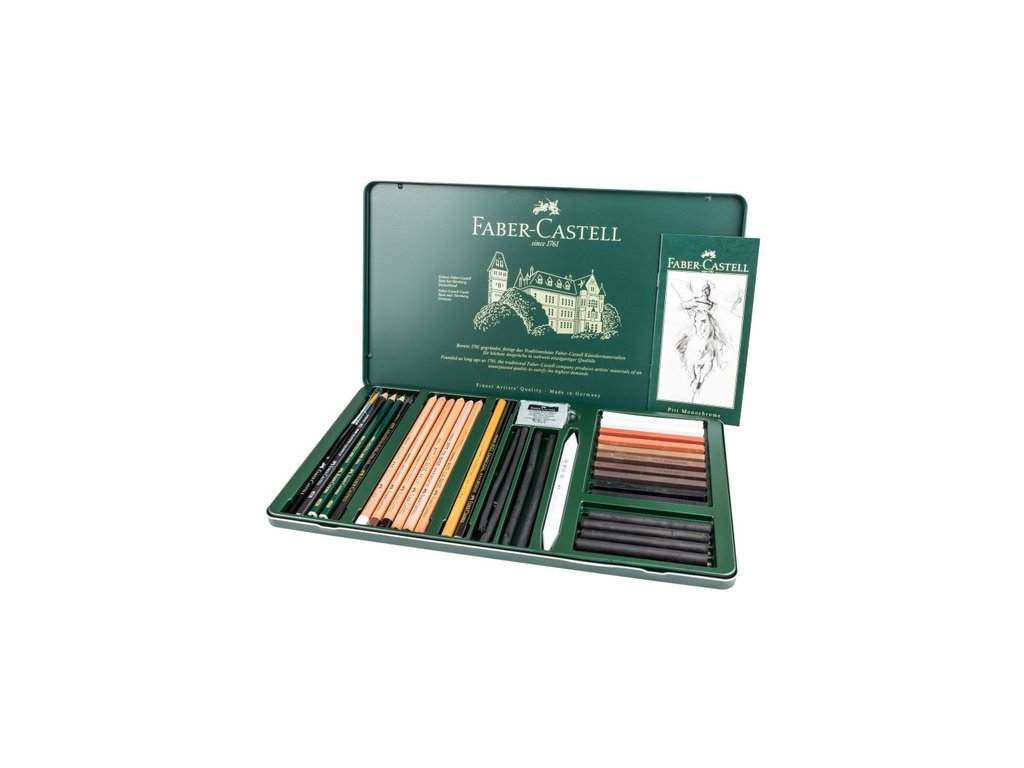 Výběr grafitových tužek, pastelů na olejové bázi v dřevěném těle, pastelových tužek, klasických pastelů a uhlů. Souprava v kovové dóze potěší začátečníka i profesionála. Sada obsahuje: 2 ks tužka CASTELL 9000 o tvrdostech 2B a 6B, 1x tužka aquarelle 6B, 1 ks tužka PITT Graphite Pure o tvrdosti 6B, 3 ks tužka PITT OIL BASE, 3 ks tužka PITT PASTEL, 8 ks pastel PITT PASTEL, 4 ks lisovaný uhel PITT, 2 ks přírodní uhel PITT, 1 ks přírodní uhel v tužce PITT, 1 ks lisovaný uhel v tužce, 1 ks pryž Art a 1 ks papírové roztírátko.