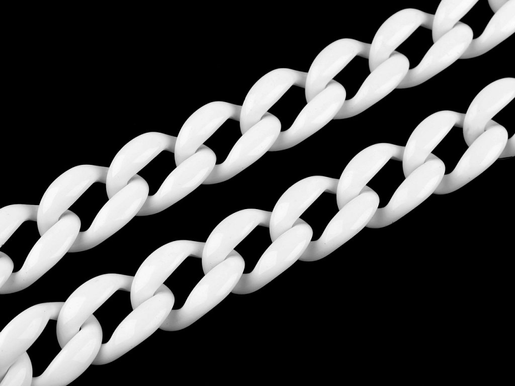 Velký designový řetěz je vyrobený z plastu. Díky tomu má nízkou hmotnost. Využijete ho na zdobení módních doplňků, k ozdobení oděvů, kabelek, bot apod. Řetěz má lesklý povrch, oka jsou plochá. Je pevný, oka dobře drží, ale dají se i rozevřít. Díky tomu můžete řetěz zkrátit na potřebnou délku.